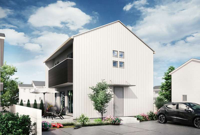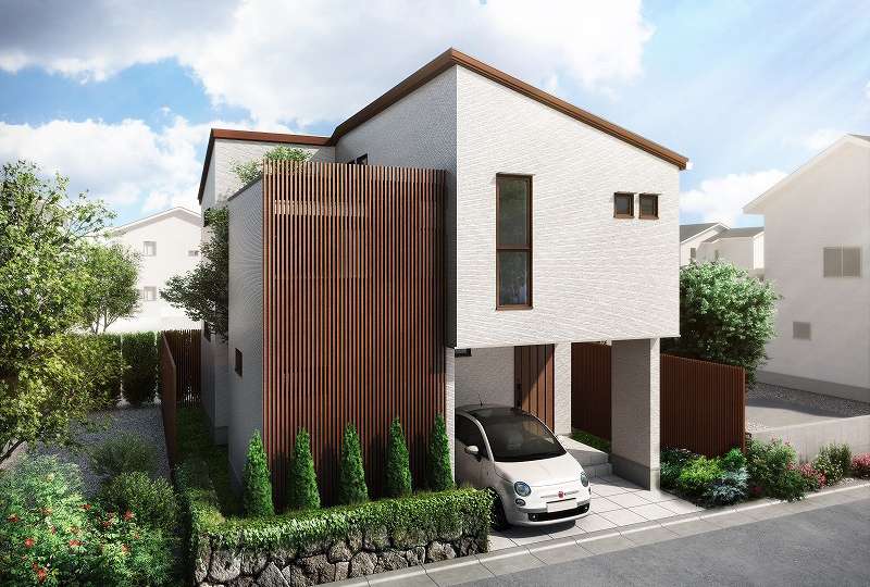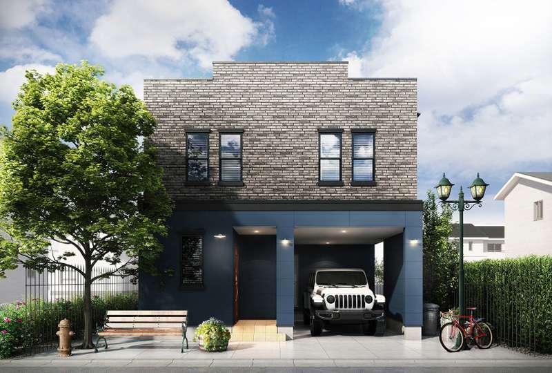 いつでもリビングから車やバイクを眺めることができる、ビルトインガレージのある住まい。アーティストの街として知られるニューヨークのブルックリンをイメージした外観が印象的で強い存在感を放ちます。